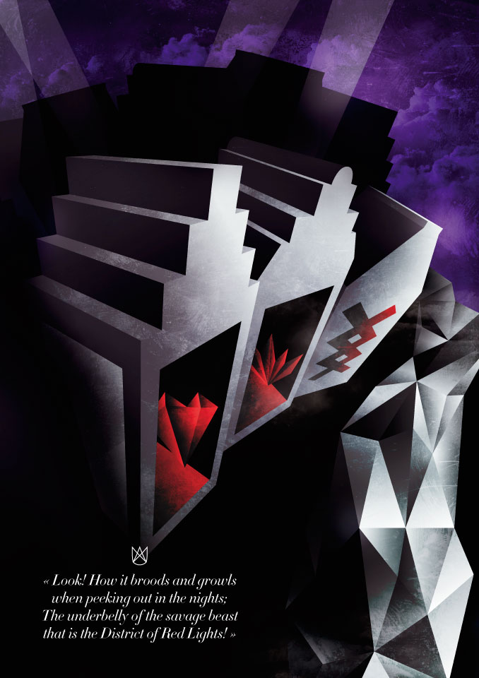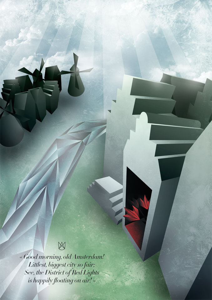 With our motel being situated in the heart of the Red Light District, we got to experience the neighbourhood as this picturesque and charming neighbourhood housing exquisite bakeries and hip design stores in the daytime, only to see it turn into this grimy nightlife central, celabrating everything sexual, mind-altering and taboo-ridden. In a nutshell, that is. I wanted to capture this contrast in the two posters, giving them a bit of a “children’s book for grownups” type of feel. The little symbol (a logo of sorts) draws together different icons of Amsterdam; the three X’s, the A and the tulip.