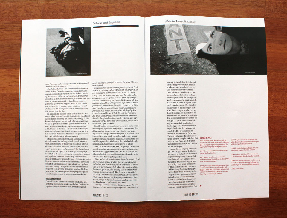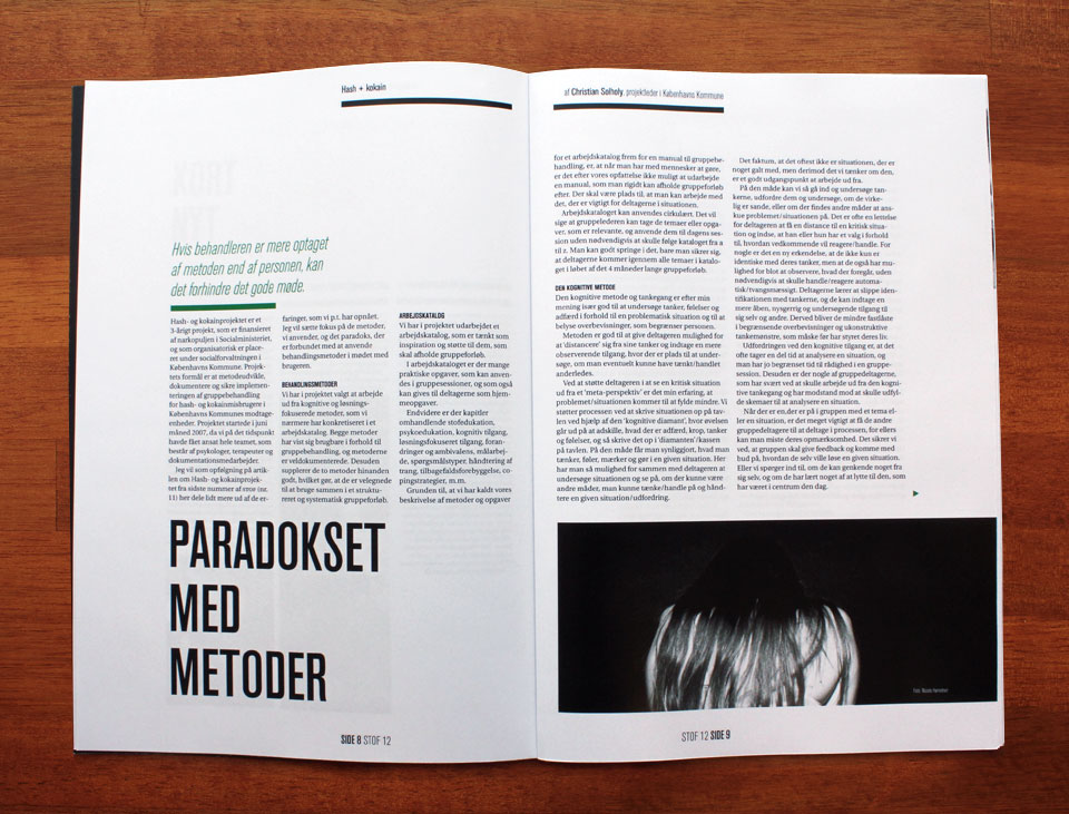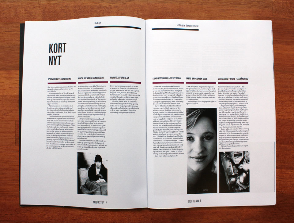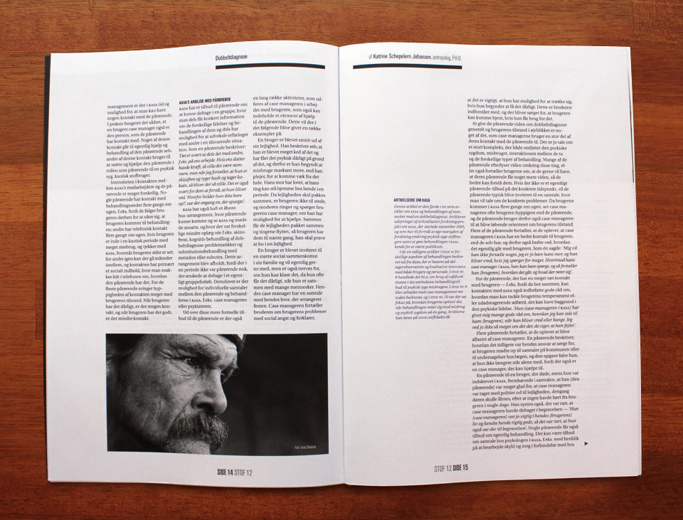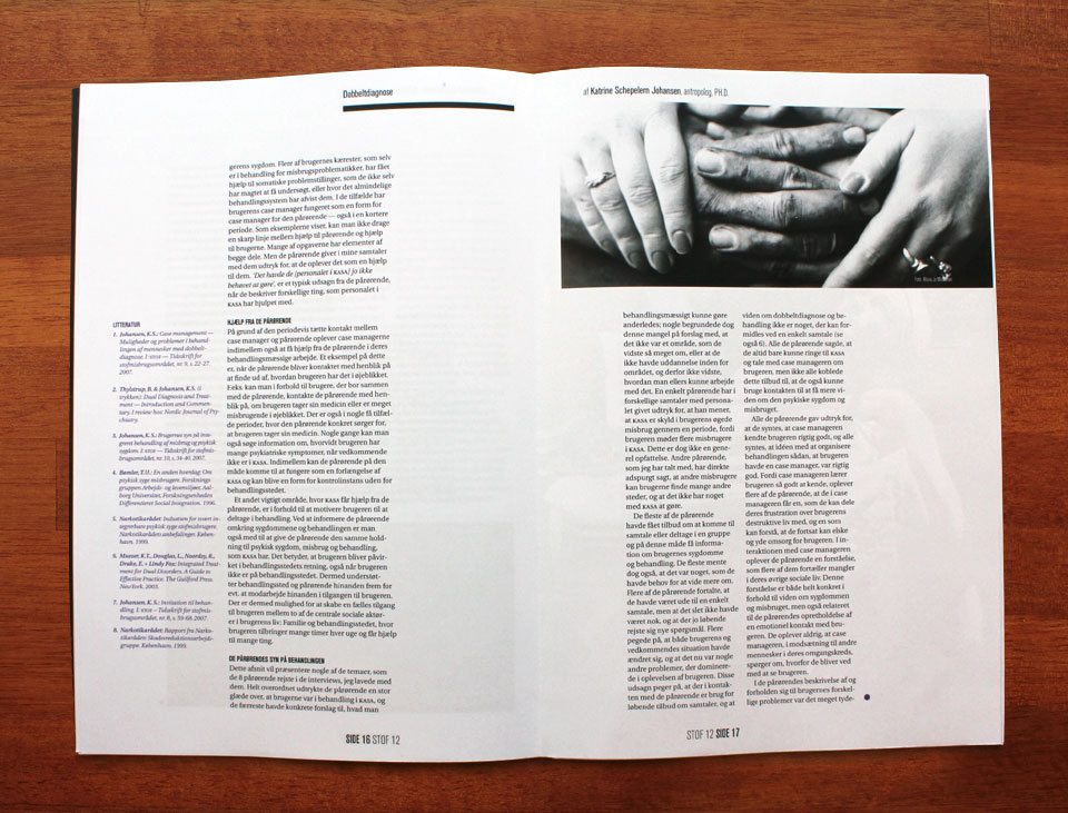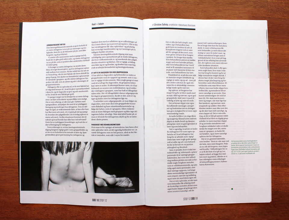 STOF, which translates to both “drug” and “matter” in Danish, is a magazine directed towards people who work with drug addicts. Each issue consists of both individual articles covering different aspects the drug milueu, as well as a larger themed section of related articles covering a specific matter.